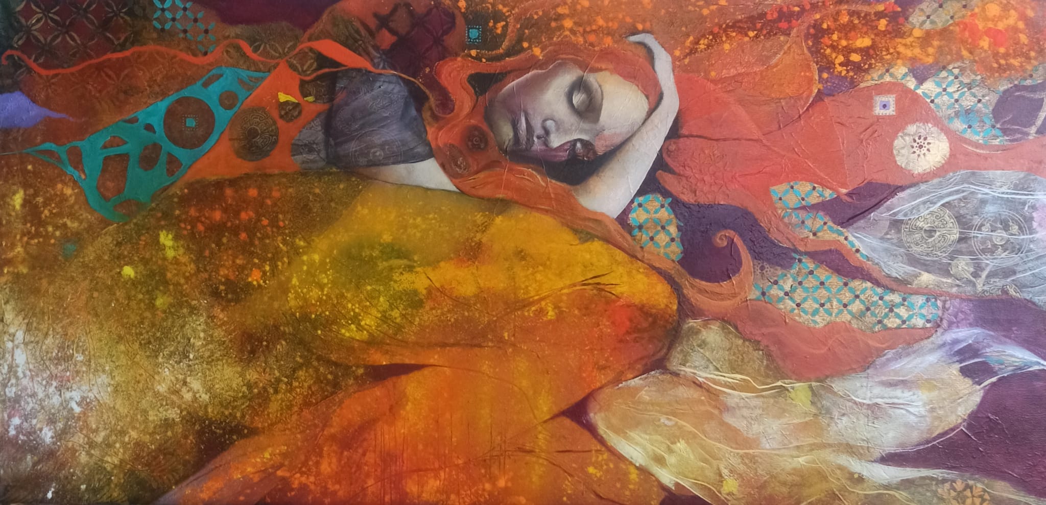 Série des dormeuses; L’heure oubliée ← Précédent Suivant → Année : 2026 50 cm x 100 cm Huile sur toile / collages
